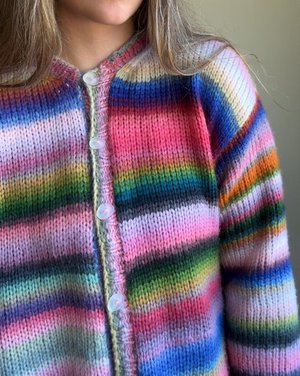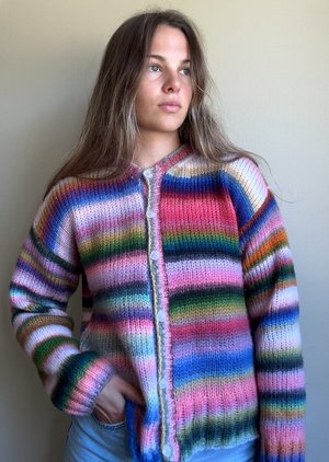 The Glow Cardigan is a colorful, light and soft cardigan. The body and sleeves are worked flat in panels and seamed together. The neckline and button band are casted on directly to the body to finish.