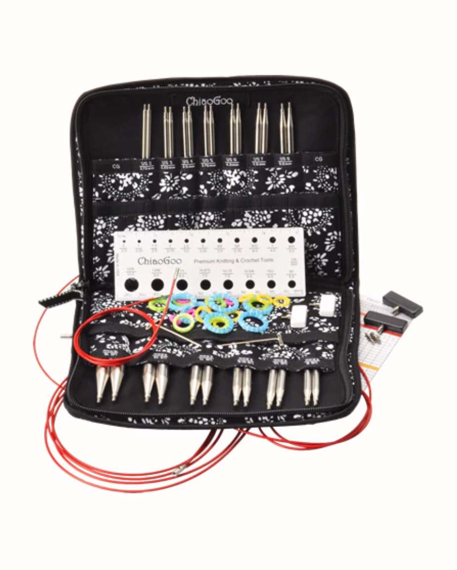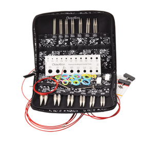 Sets include 4″ (10 cm), surgical stainless steel, lace tips in sizes US 2-15 (2.75mm-10mm) and three cable lengths: 8″ (20 cm), 14″ (35 cm), and 22″ (55 cm) cables to make 16″ (40 cm), 22″ (56 cm), and 30″ (76 cm) circulars. TWIST™ red cables are memory free and consist of a multi-strand, steel cable coated with red nylon. Also included with each set are easy-to-read, coded end stoppers, T-shaped tightening keys, and stitch markers, as well as a cable connector, a needle gauge and compact, zipper-enclosed, fabric case. TWIST™ & SPIN™ tips, cables and accessories are all switchable!